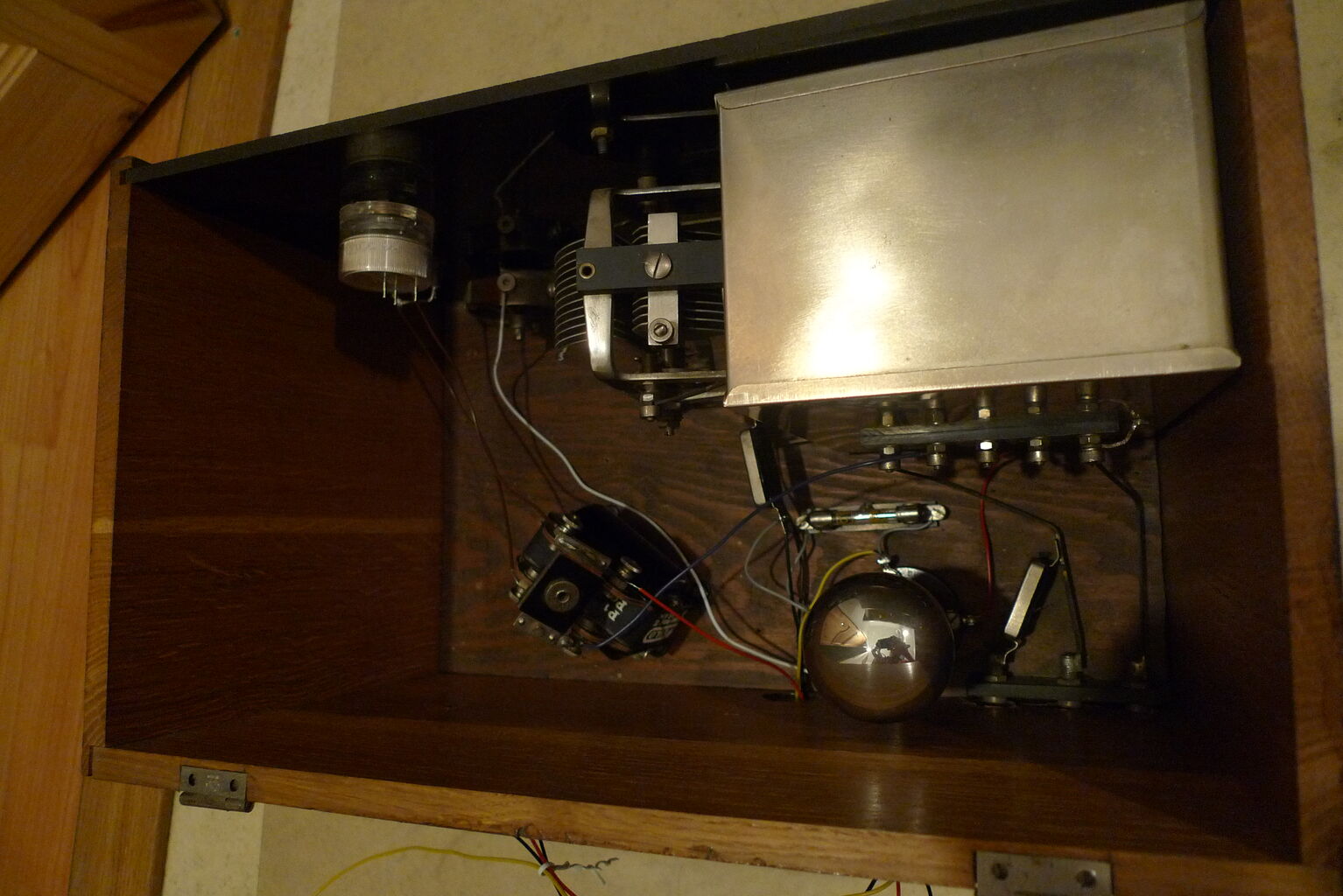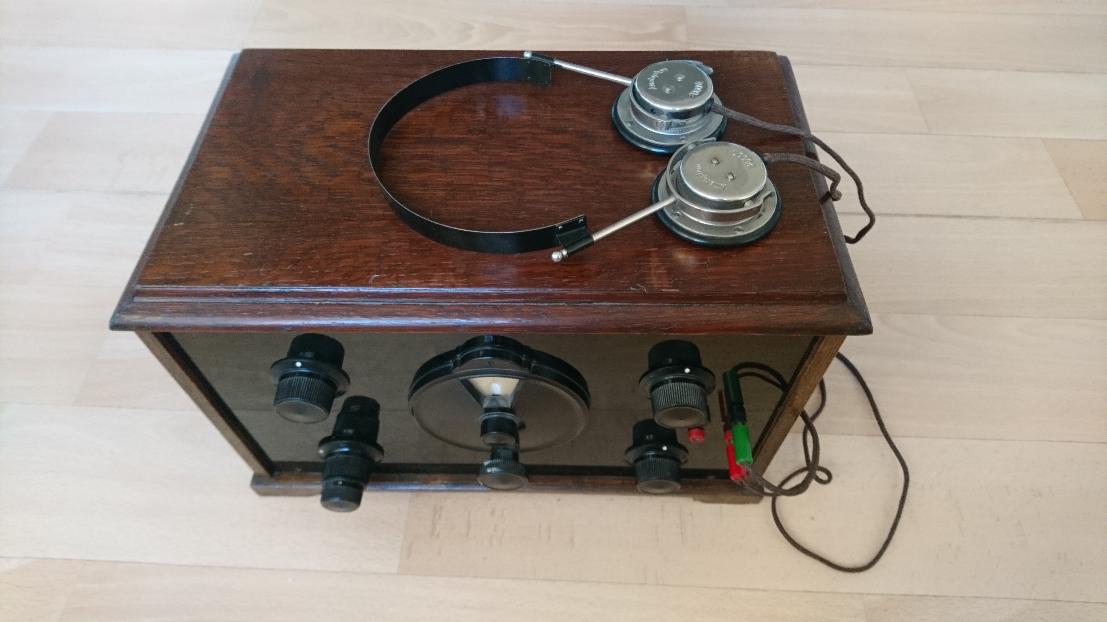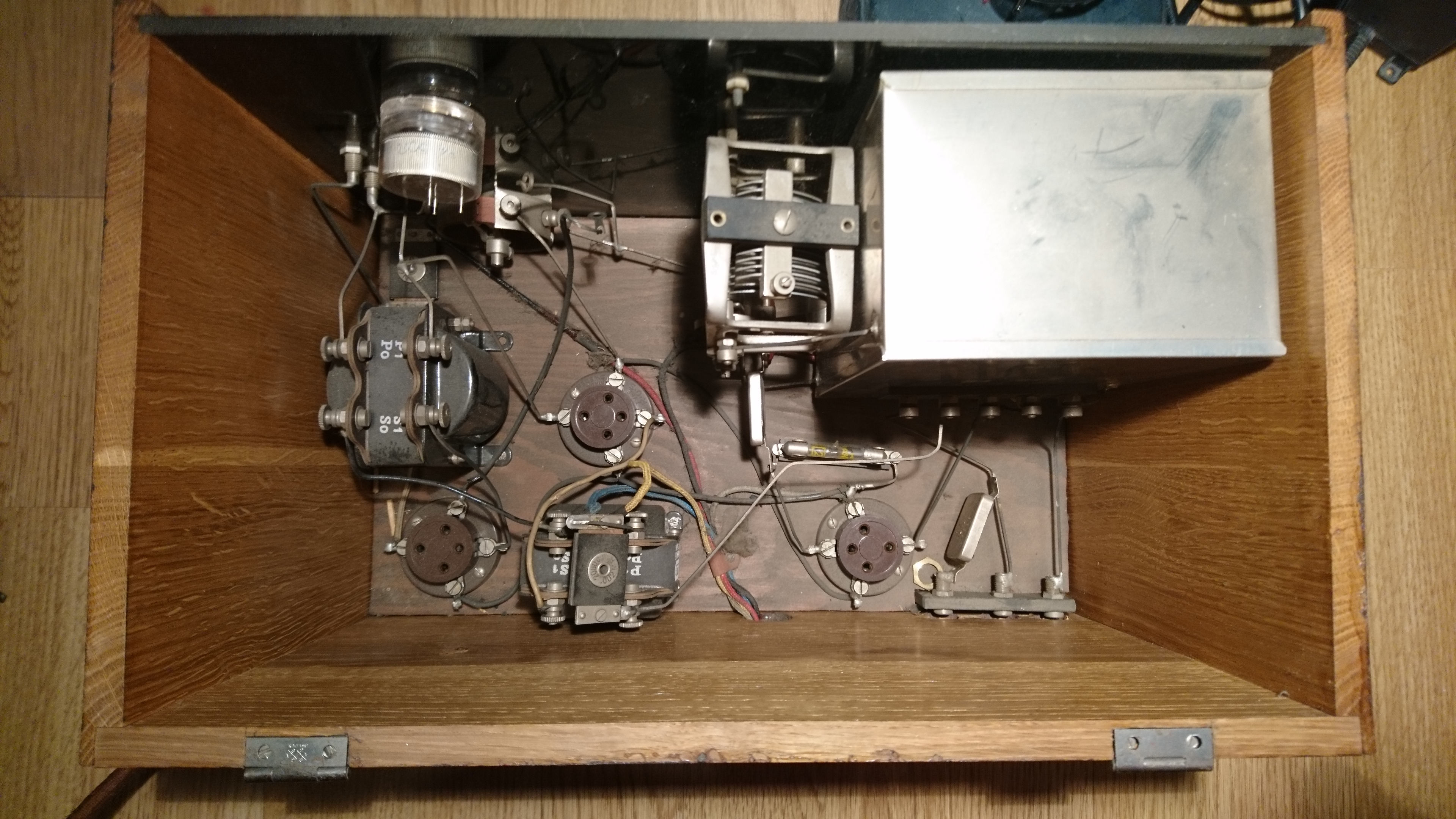 Bought for 72 SEK at an online auction. Model unknown, but all identifiable components (tube sockets, capacitors) are Swedish-made except the transformers which are German (Weilo), and the grid leak resistor, a 2Mohm vacuum resistor of unknown brand.