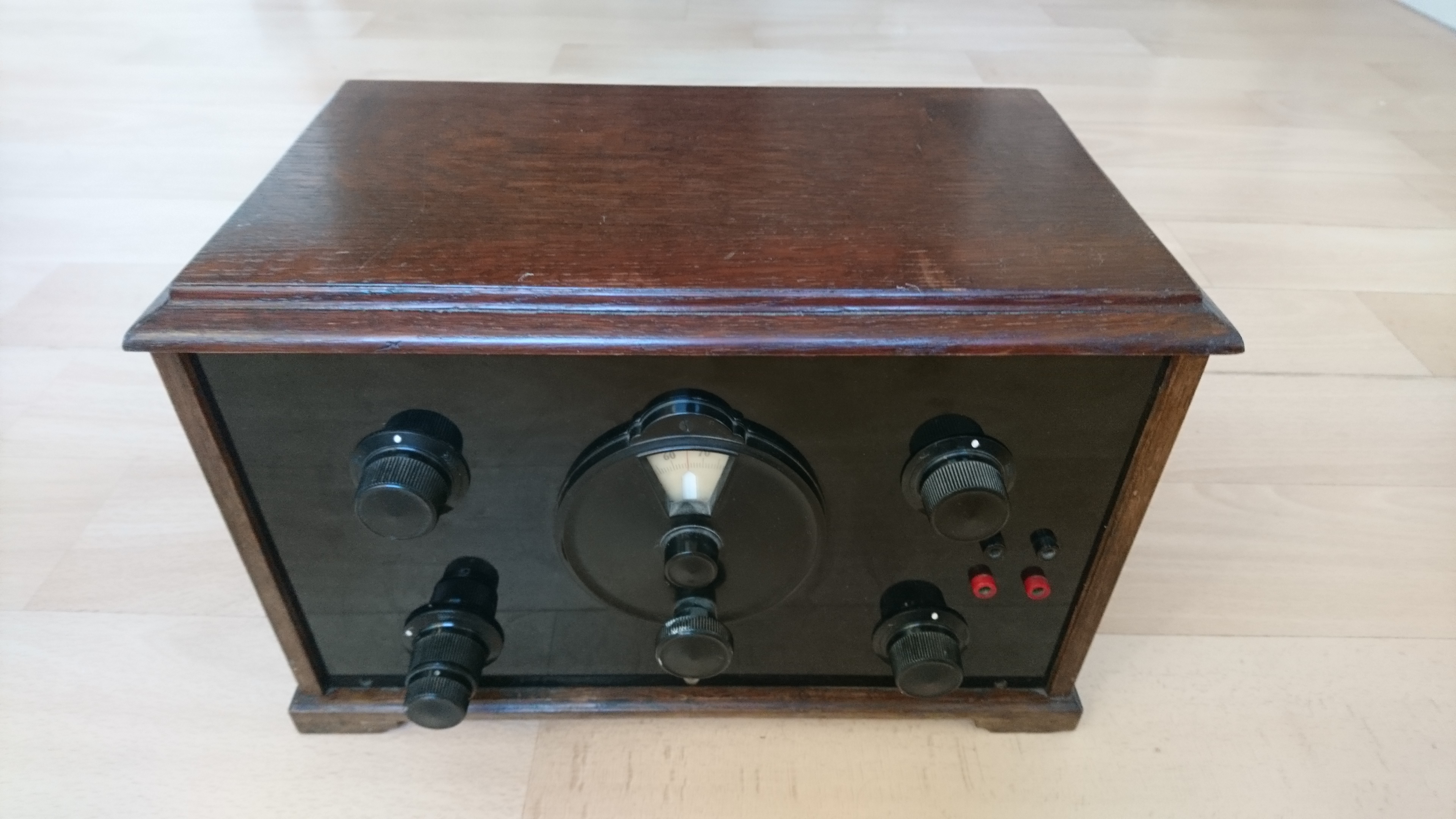 Bought for 72 SEK at an online auction. Model unknown, but all identifiable components (tube sockets, capacitors) are Swedish-made except the transformers which are German (Weilo), and the grid leak resistor, a 2Mohm vacuum resistor of unknown brand.