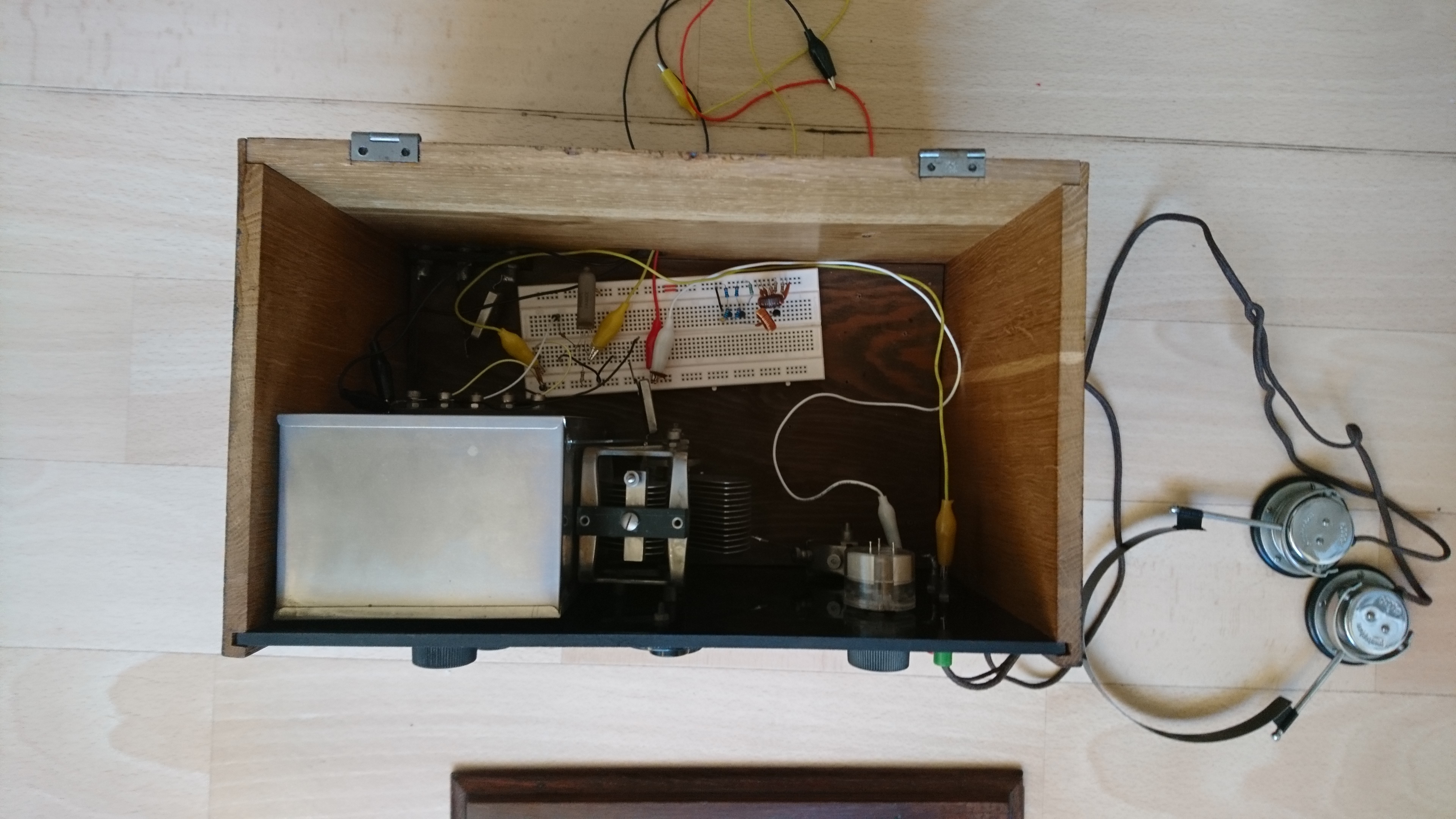 In the second to last image below you can see a prototype with two battery pentodes (1.25V filament, 36V supply). The final picture shows the final version, a one-tube version which is basically the original with the audio amplification chain removed. Unfortunately I do not have enough of these antique triodes to populate a full 3-tube receiver.